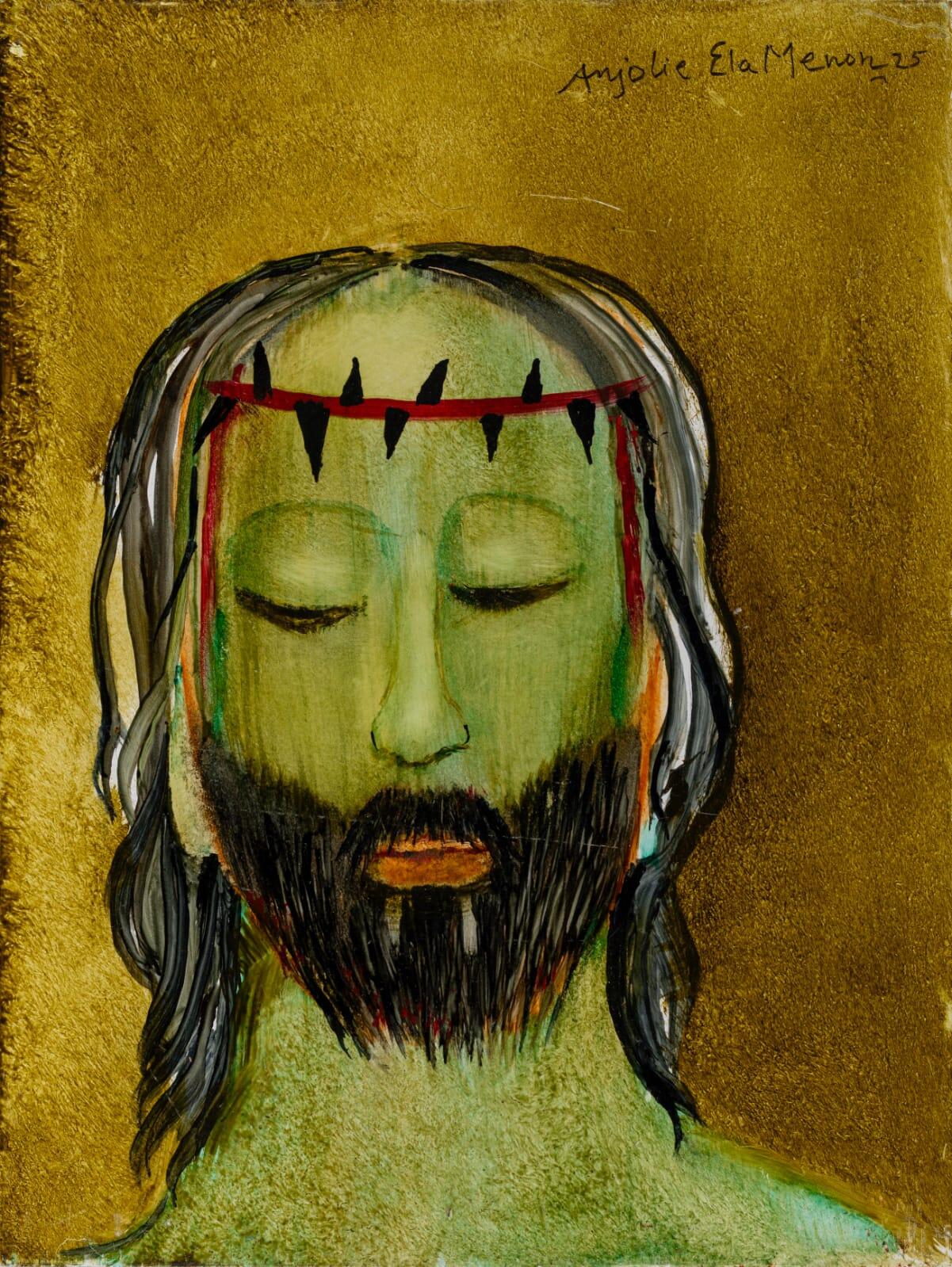 Anjolie’s Christ heads and Pyotr the portrait of the Russian Orthodox priest are seemingly among her most evocative and expressionist. Pyotr comes as a flashback of her stay in Russia .In these paintings, the mottled coloration of mineral tones evokes feelings of fascination. Christ created as an image in the tenor of her husband Raja Menon is one of her favourite subjects.The mention of Raja brings forth an angelic, coy smile from Anjolie and you silently admire the emotive essence of deep connections born of love in a world in a web of wars born from races within races.
