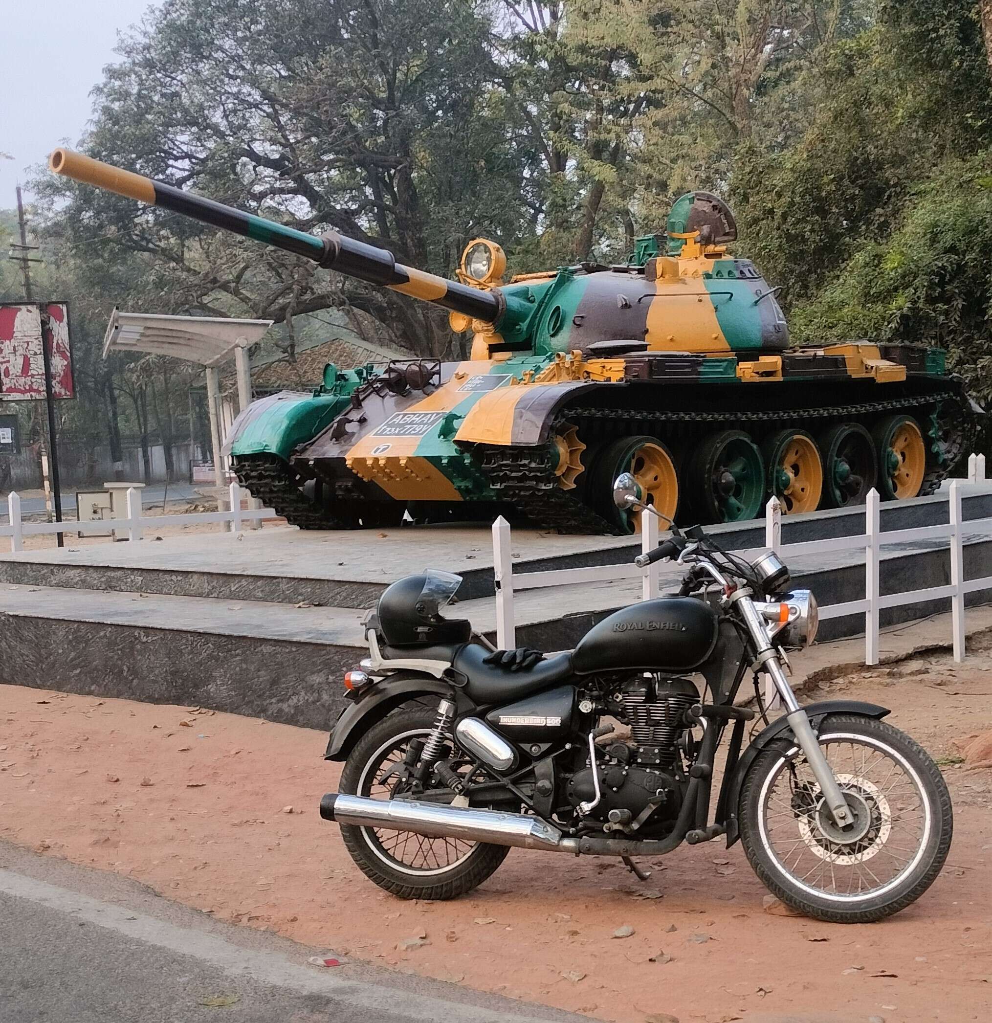 We set a rendezvous for 7.20 am near the T-55 tank displayed on Dakra Road, Garhi Cantonment. True to form, Vinay arrived at exactly 7.19 am on his Honda CB 350, while I was still fumbling with my phone, trying to get a flattering shot of Grumpy with the tank.