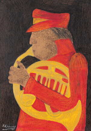 Krishen Khanna the 100 year old author, critic and eminent artist is represented by a host of paintings as well as sculptures belonging to his treasured Bandwallah series. Within his creations one reckons a love for the wind instruments and the bugles and the uniforms all have a zesty ensemble of colour and gaiety. Khanna has lived a life loving and creating his own series on human lives and the pages of living through his own observations that run a sensibility of sensitivity and human fervour.One can glimpse and savour both colour and contour within the hand of narratives that creates leaves of both time past and time present within the last of the Indian Progressive Masters.