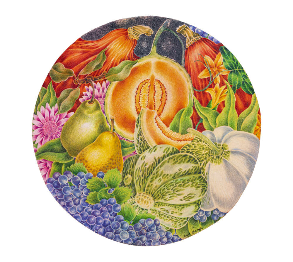 Her ingenuous immersion in the European and Indic civilisations is a meticulous manifestation of her explorations of the history of art, through the fine intricate detailing of her work. Between her flowers, fruits, humans and botanical brilliance she returns to the form of the tondo, a circular painting developed during the Renaissance periods ; the beauty of these circular works is the felicity and fluidity of her drawings, rendered with the Rotring, pen that was integral to her architectural education.Between her sensitivity to contours and colours she fleshes in a mural like cadence to create corollaries that are never ending.