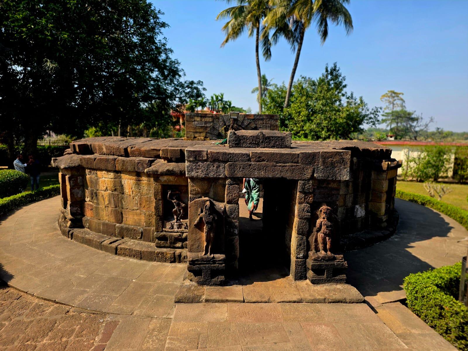 The temple is small and circular, only 25 feet in diameter. It is built of blocks of sandstone. The inside of the circular wall has niches, each housing the statue of a goddess. Fiffy-six of the 64 idols, made of black stone, survive. They surround the main image at the centre of the temple, the Goddess Kali, who stands on a human head, representing the triumph of the heart over the mind. The temple seems to follow a mandala plan, in a way that concentric circles are formed, while a Shiva at the centre inside the inner sanctum is roundly surrounded by four Yoginis and four Bhairavas.